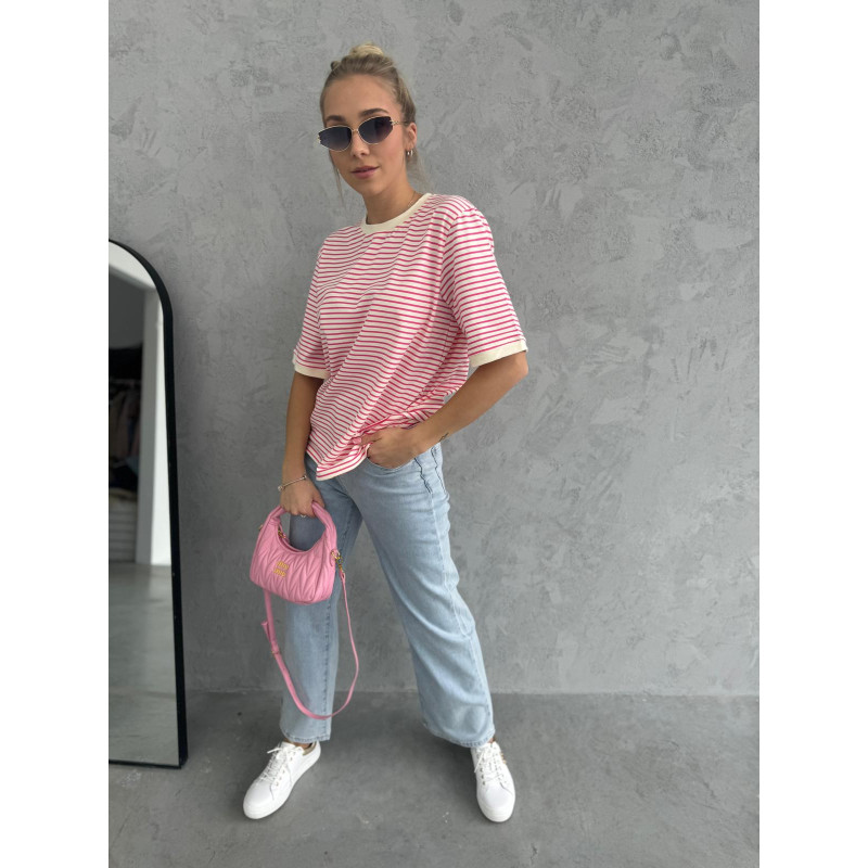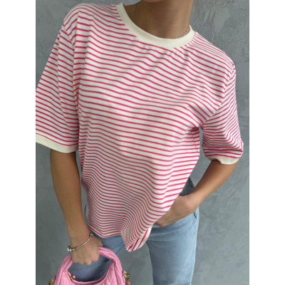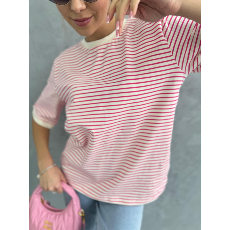 T-shirt STRIPES w odcieniu kremowym z modnymi, cieniutkimi paskami w kolorze intensywnej fuksji to kwintesencja świeżego, wiosenno-letniego stylu.