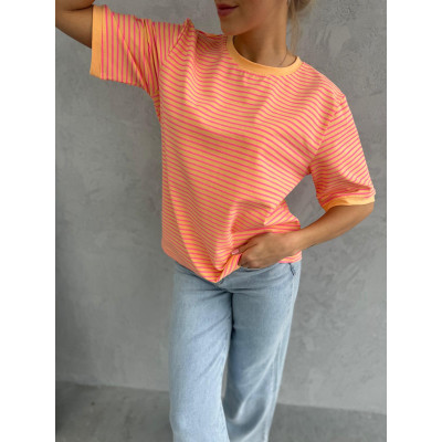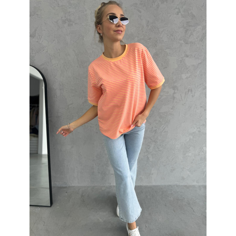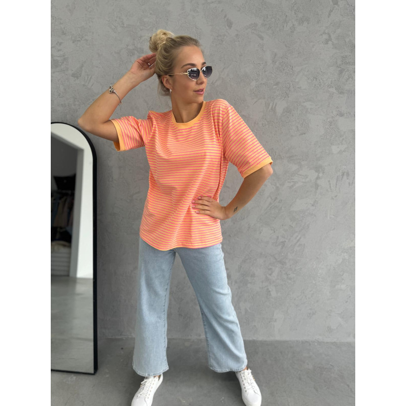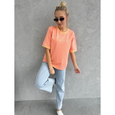 T-shirt STRIPES w odcieniu pastelowej pomarańczy z modnymi, neonowymi paseczkami to kwintesencja świeżego, wiosenno-letniego stylu.