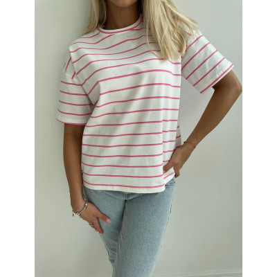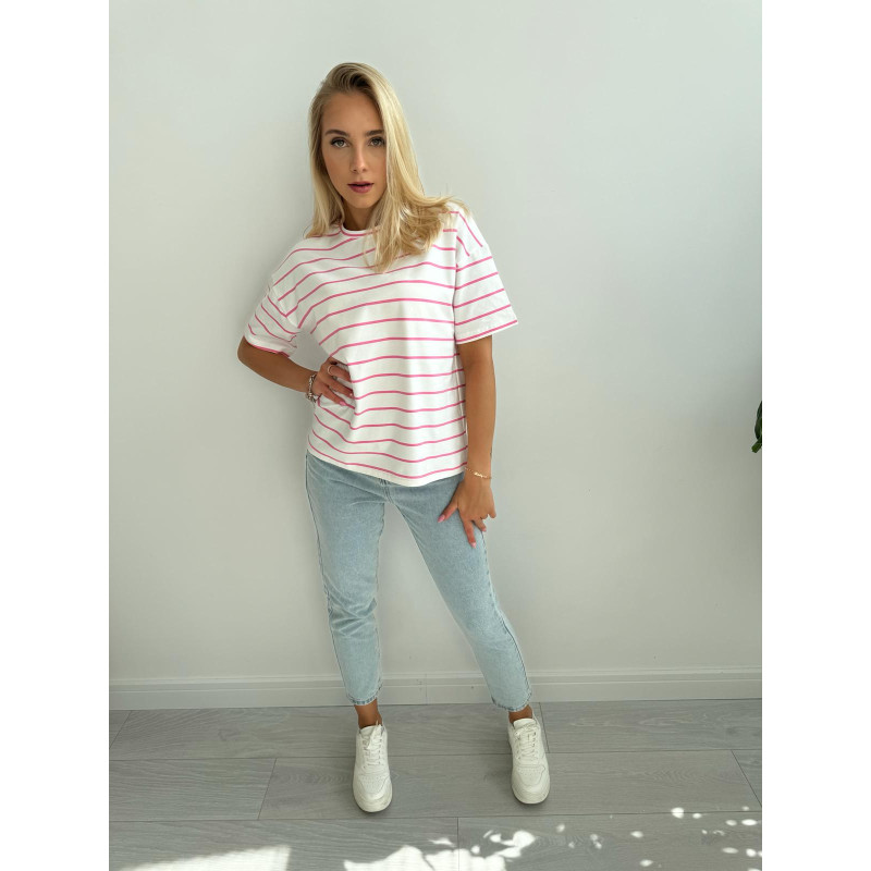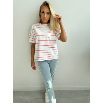 T-shirt STRIPES - klasyczny, biały kolor bazy połączony z cieniutkimi paseczkami w odcieniu nasyconego, neonowego różu - mega modny wzór tej wiosny!